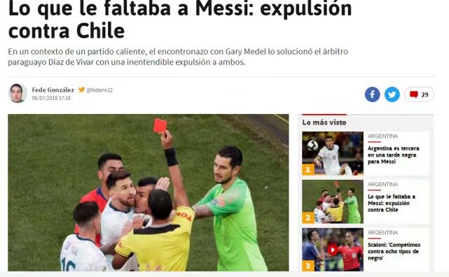 在阿根廷2-1战胜智利夺得本届美洲杯季军之后,本场被裁判红牌罚下的梅西拒绝前往领奖台。据阿根廷媒体Tyc报道,梅西认为自己是由于此前公开讨论判罚而在这场比赛中遭到裁判针对,他对此感到气愤,并拒绝接受颁奖以示抗议。在比赛第37分钟,梅西和梅德尔爆发冲突,双方互相顶胸,主裁判在与VAR确认后直接出示红牌将两人同时...也许您还喜欢:世界杯直播 亚洲杯直播 欧洲杯直播 足球直播