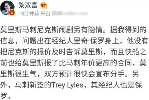 里奇保罗(詹皇经纪人)没有将尼克斯的报价及时告诉小莫里斯,而且快船之前的报价比马刺年薪更高。原本加入里奇保罗旗下,小莫里斯就是因为将詹姆斯视为偶像,才会选择相信里奇保罗,但是没有想到里奇保罗竟然不顾球员利益,隐瞒其他球队的报价,还公开欺骗了小莫里斯,根据名记Chris Mannix之前的报道,小莫里斯对于自由球员...也许您还喜欢:世界杯直播 亚洲杯直播 欧洲杯直播 足球直播
