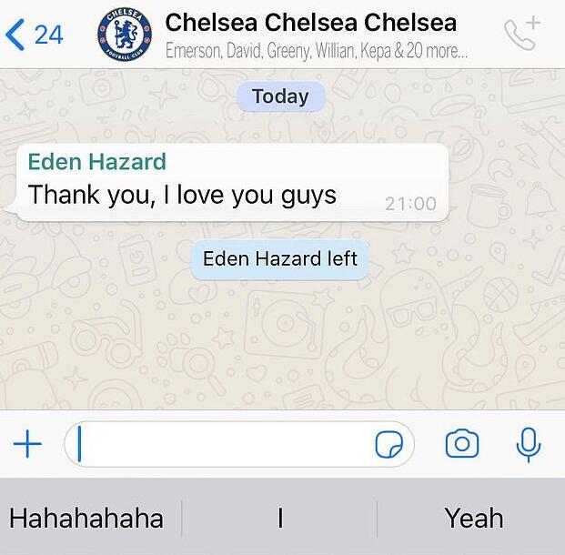 切尔西左后卫埃莫森透露,阿扎尔在正式加盟皇马之后,在切尔西球员的WHATSAPP聊天群,礼貌地说了一句:“谢谢,兄弟们,我爱你们”,然后就退群了。