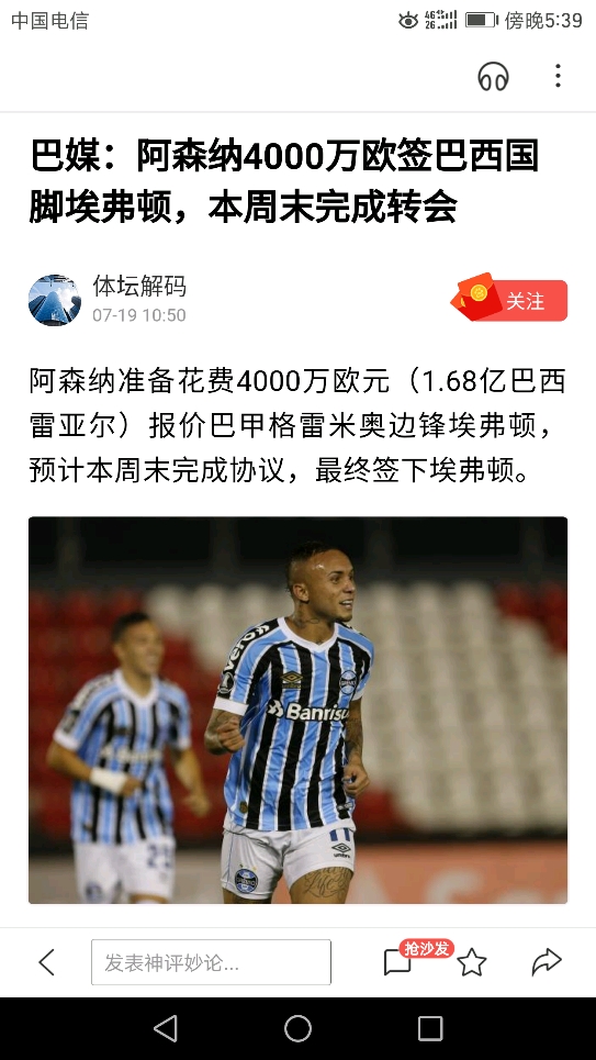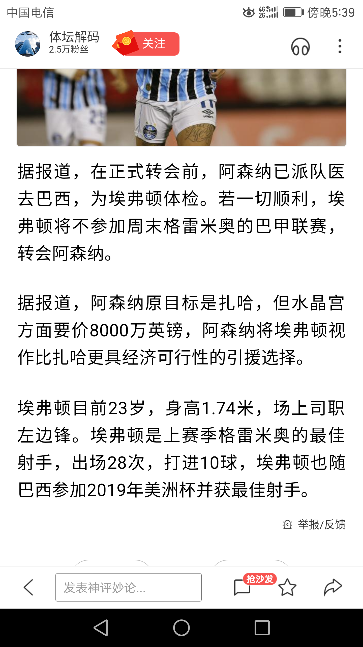据巴西媒体报道,阿森纳已与埃弗顿达成协议,已派队医给埃弗顿进行身体体检,预计在本周内完成协议。