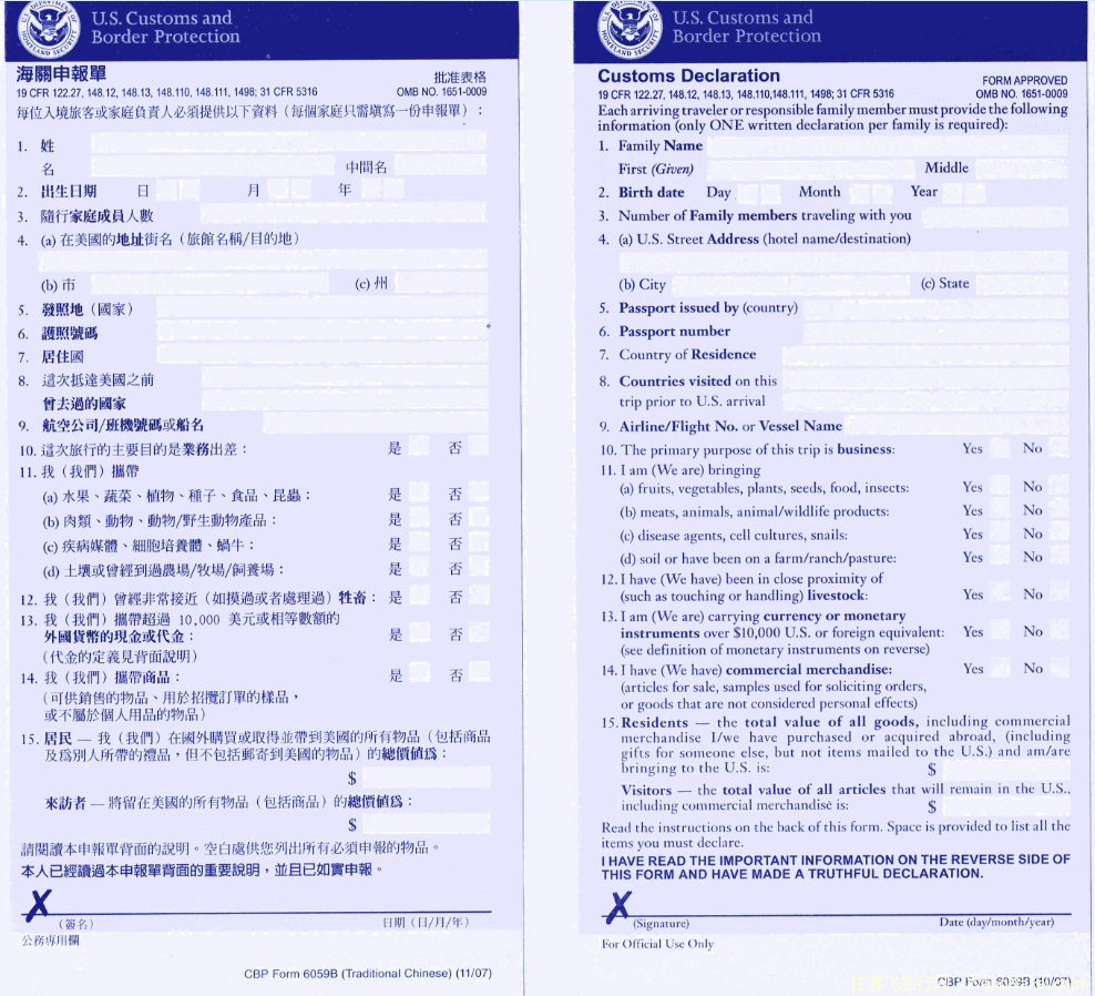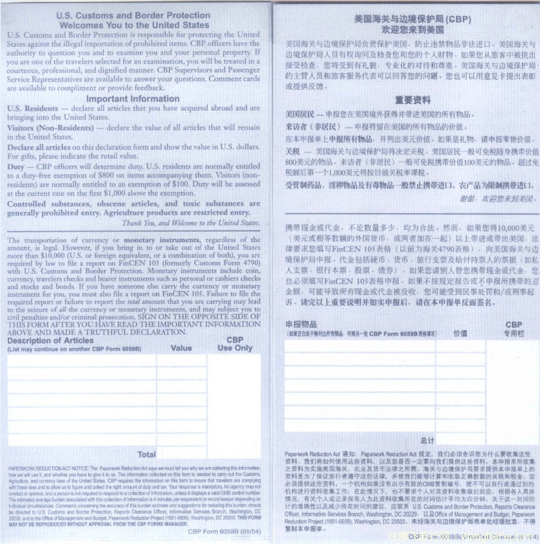 在飞机上空姐会发一张海关申报表,在下飞机前一定要填完,飞机上只有少量的中文表格,所以建议大家将下图为中英文对照表格保存一下,避免你拿不到中文表格。