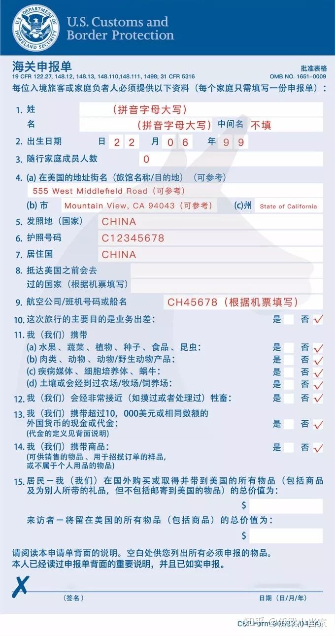 填表必须以大写字母英文填写。海关申报单以家庭为单位,直系亲属可填写一张表格,如不懂英语,座位前航空杂志有各个项目的中文译本,对应用英语填写: