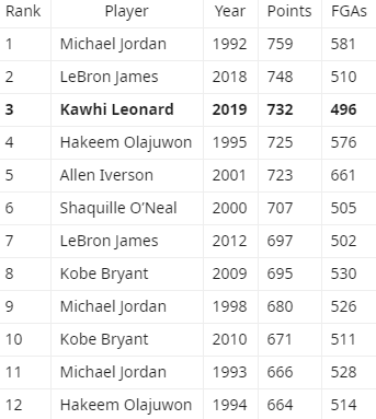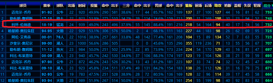 732分的得分仅次于1991-1992赛季乔丹的759分和2017-2018赛季詹姆斯的748分,排名历史季后赛单赛季得分第三。