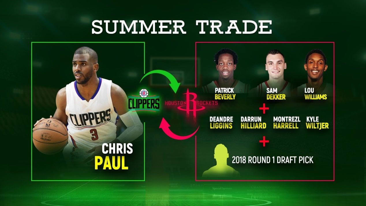 1.火箭队送出贝弗利、路易斯-威廉姆斯、德克尔、哈雷尔等七名球员+2018年首轮选秀权+部分现金,从快船队得到保罗。
