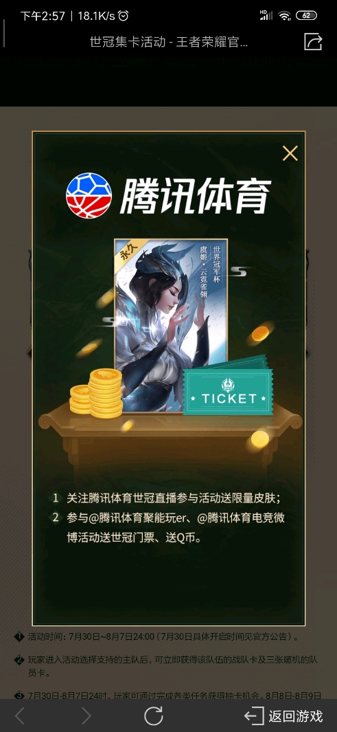 《王者荣耀》是由腾讯游戏天美工作室群开发并运行的一款运营在Android、IOS、NS平台上的MOBA类手机游戏,于2015年11月26日在Android、IOS平台上正式公测,游戏前期使用名称有《英雄战迹》、《王者联盟》。《Arena Of Valor》,即《王者荣耀》的欧美版本于2018年在任天堂Switch平台发售。 王者荣耀是类dota手游,游戏中的玩法以竞技对战为主,玩家之间进行1V1、3V3、5V5等多种方式的PVP对战,还可以参加游戏的冒险模式,进行PVE的闯关模式,在满足条件后可以参加游戏排位赛等。 2016年11月,《王者荣耀》荣登2016中国泛娱乐指数盛典...