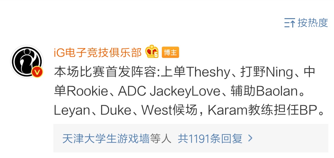 看来IG还是不会放弃Ning的,毕竟上限是总决赛MVP级别的,而且这次替补之后,Ning的态度也比较端正,好好rank,也一直在上分,估计日常表现也比以前好很多,而且这次IG要是可以练出双打野的套路,说不定也是巨大提升呢。也许您还喜欢:世界杯直播 亚洲杯直播 欧洲杯直播 足球直播
