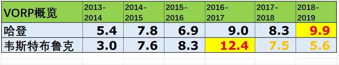 我们对比VORP值可以很清楚地洞悉,其实威少自2018-2017赛季后,个人对于球队的不可替代性已经开始走低。看到威少已经巅峰不再的现实,火蜜肯定又是一阵叹息。
