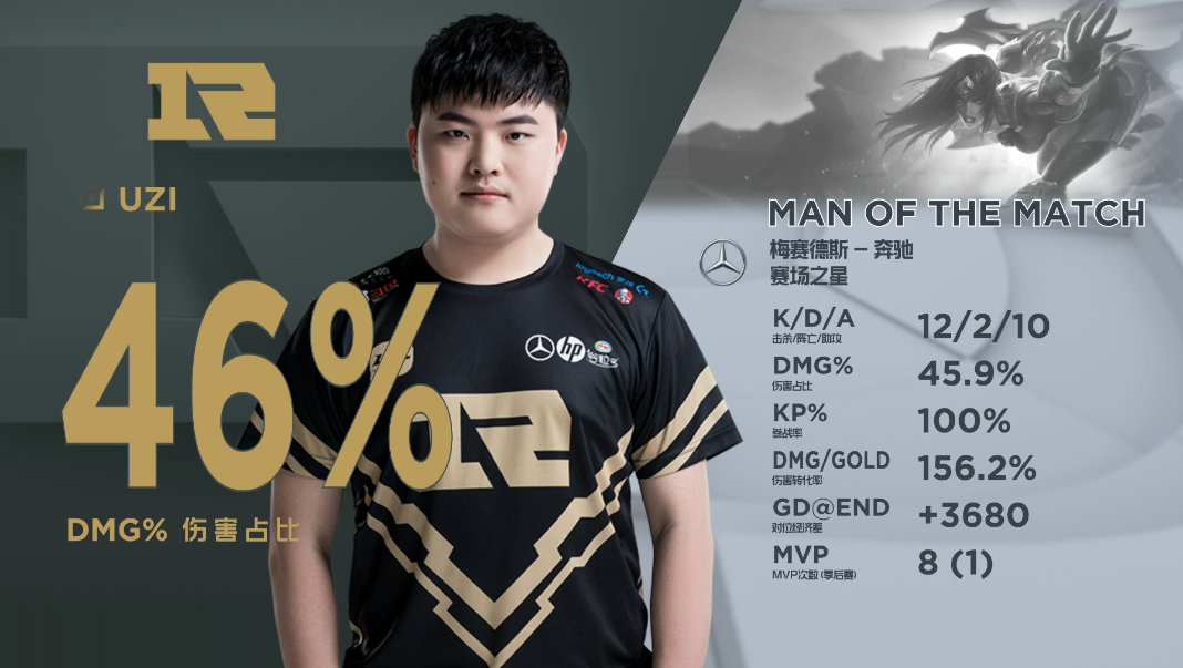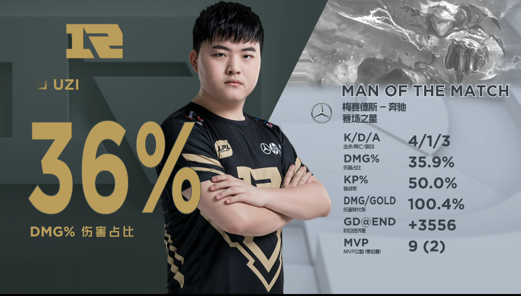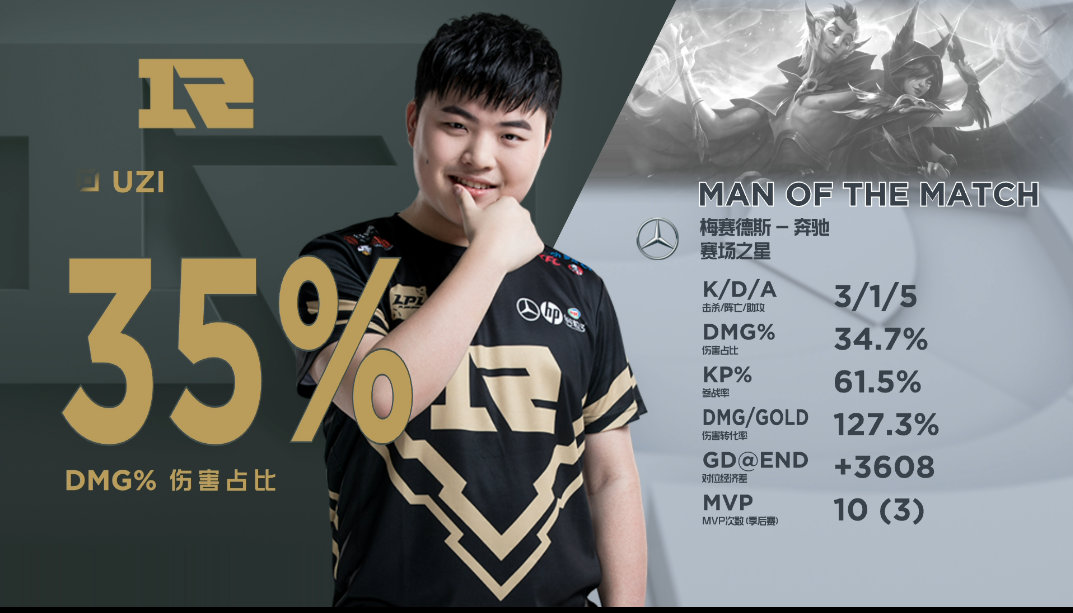 今天RNG3-1有惊无险的赢下LNG,赢得三局比赛Uzi包揽了全部的MVP,今天实打实的carry了全场。第一盘大龙关键一波,他在小虎被秒的情况下疯狂输出,团灭对面一波比赛,第二把又是他抓住了卡莎的失误,和小明一起秒了卡莎进而带走对手,第三盘运气没有站在Uzi身边,就差一丝血就可以拆家3-0带走对面,好在第四盘的Uzi输出继续拉满,最终赢下比赛。到了季后赛Uzi的状态可以说是已经爆表,看好他继续超神带领RNG进入世界赛!