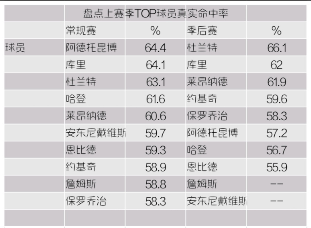 阿德托昆博库里领衔常规赛,KD库里领衔季后赛。 其中到了季后赛只有三位球员真实命中率上升,分别是,凯文杜兰特,莱昂纳德,约基奇。也许您还喜欢:世界杯直播 亚洲杯直播 欧洲杯直播 足球直播