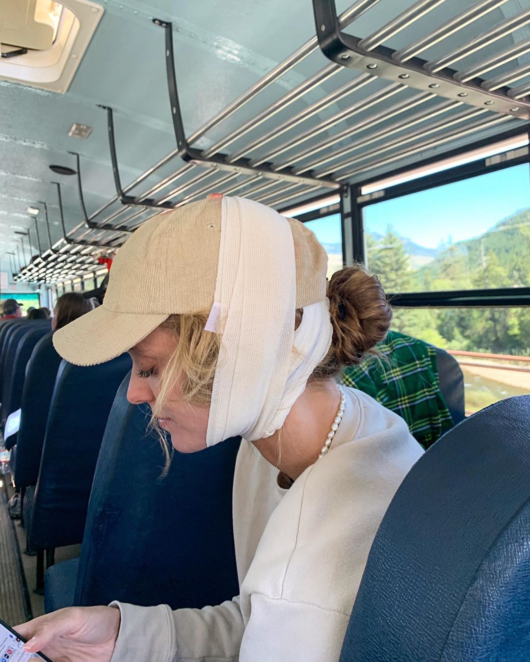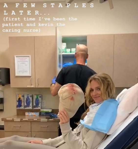 乐福晒出一组女友头部受伤进医院治疗的照片,Kate Bock的帽子上血迹明显。
