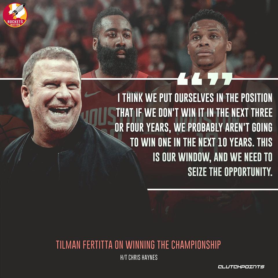 火箭老板费尔蒂塔称火箭的夺冠窗口就在未来3-4年,如果把握不住,接下来10年内都不会拿到冠军。
