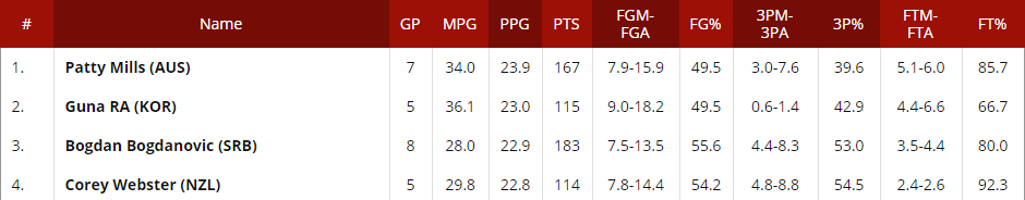 在本场比赛之前,米尔斯稳居得分榜首位,但今天只得15分的表现让以2分之差错失了这项荣誉...