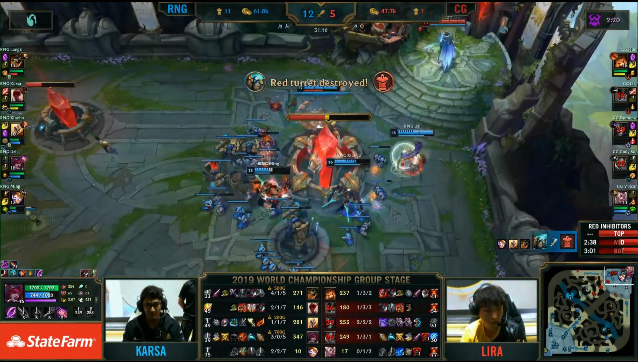 在S9全球总决赛小组赛中,rng首先面对入围赛上来的cg,作为lpl第一个出战的队伍,rng稳扎稳打,凭借小明的机器人疯狂带节奏,最终稳稳拿下一分,也为lpl取得了开门红。?