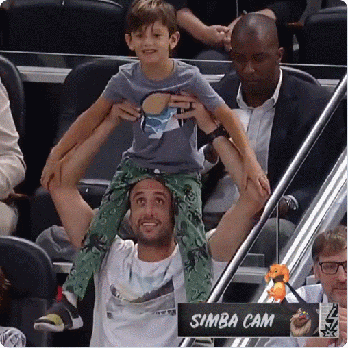 马努近期在球场边被镜头扫到,当时正在进行“Simba Cam”的游戏,类似Kiss Cam,就是被镜头扫到的观众模仿《狮子王》中国师举着小辛巴的经典镜头。