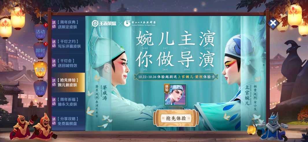 相信大家都已经在做任务准备领取婉儿四周年了,在这期间我们其实还是能够体验一把新皮肤的在活动中公告的第六个可以领取体验卡呦没领的小伙伴快去领取吧!