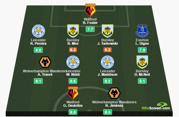 足球数据网站Whoscored评选本轮英超最佳阵,Big6无一人入选!门将:福斯特(沃特福德)后卫:R-佩雷拉(莱斯特城)、米(伯恩利)、塔尔科夫斯基(伯恩利)、迪涅(埃弗顿)中场:特劳雷(狼队)、恩迪迪(莱斯特城)、麦迪逊(莱斯特城)、麦克尼尔(伯恩利)前锋:德乌洛费乌(沃特福德)、希门尼斯(狼队)