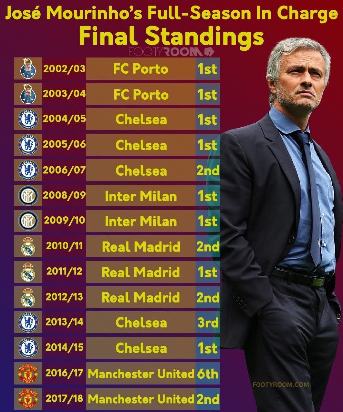 只有16-17赛季带曼联的时候拿到了第六名,而且只有带曼联没有拿到联赛冠军,其他的几个球队,波尔图、切尔西、国米和皇马都拿到过联赛的冠军。