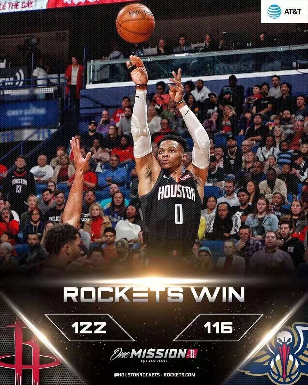 哈登威少合砍65分,率队战胜鹈鹕,火箭4连胜结束甜蜜赛程