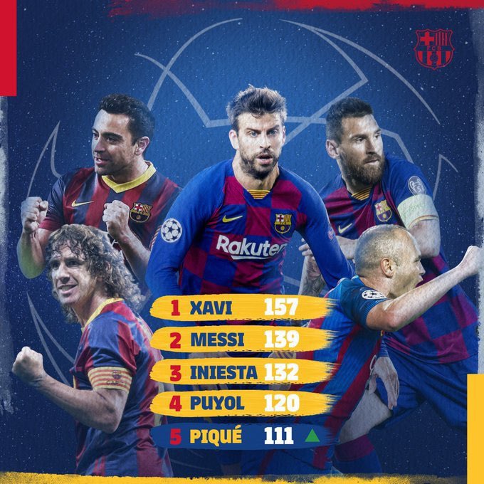 厉害了,皮克成巴萨欧冠队史第5