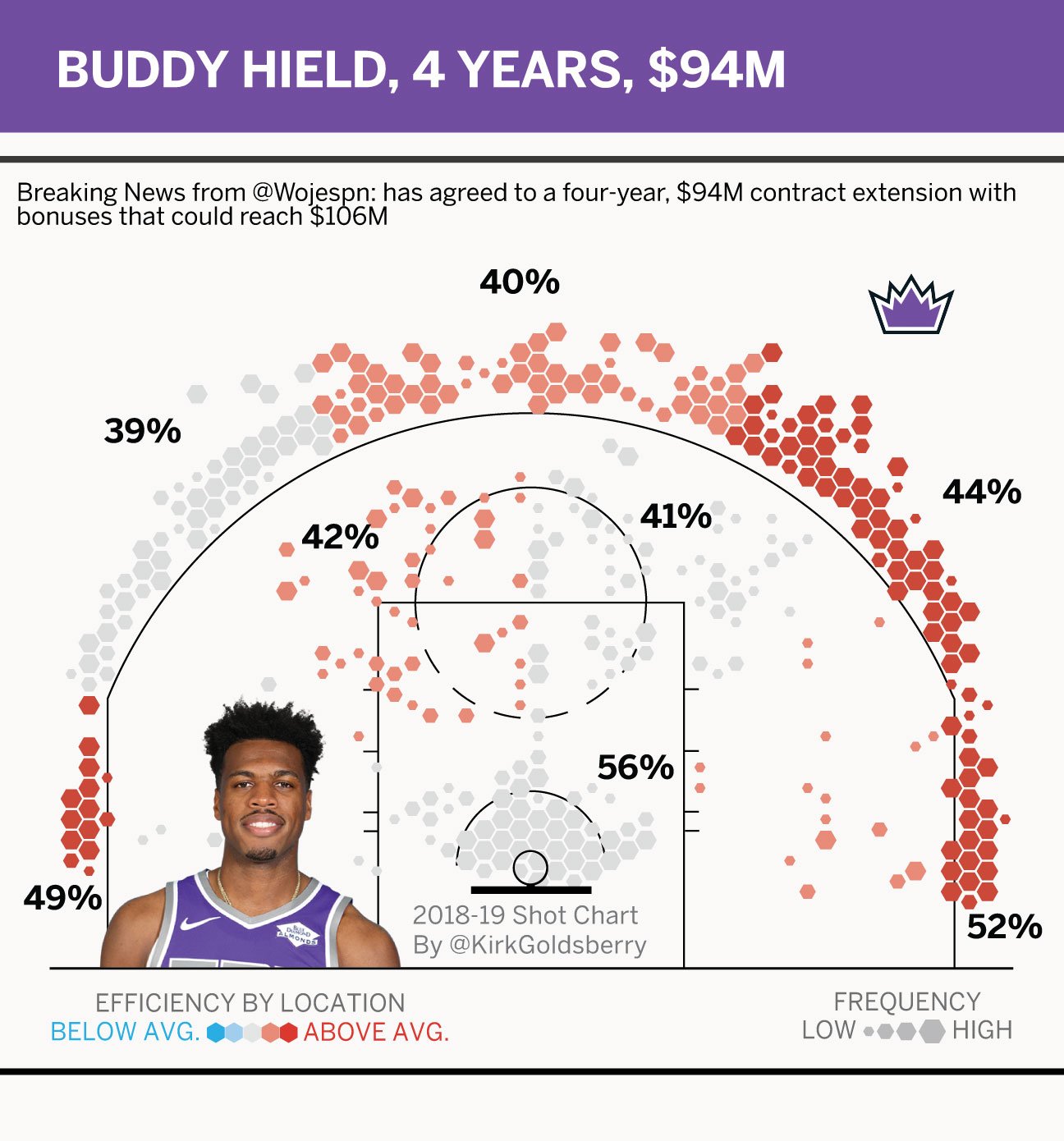 联盟消息人士告诉ESPN:国王队后卫希尔德已经同意与国王续约4年,合同价值9400万美元,加上奖金可能达到1.06亿美元的合同。而另一个数据表明:希尔德是NBA最好的射手之一。如图,在上个赛季只有2名球员投进了超过250个3分,而同时超过40%的命中率的只有库里和希尔德。那么你觉得希尔德值得这份合同吗?也许您还喜欢:世界杯直播 亚洲杯直播 欧洲杯直播 足球直播