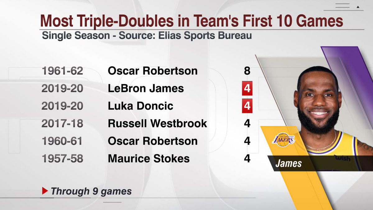 这是本赛季到现在勒布朗的第4个三双,成为历史上第5个赛季前10场比赛中打出最少4场三双的球员,也是湖人队史上第一个做到的球员。