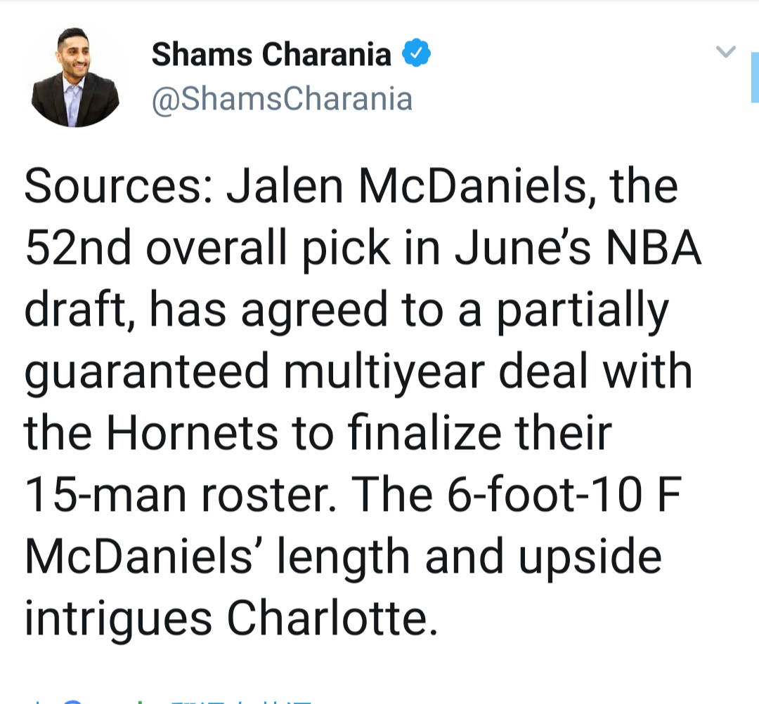 麦克丹尼尔斯是今年的第52顺位,而他吸引黄蜂的正是他两米零八的身高和上升空间。他在大学期间场均出场31分钟,能得到15.9分2.1助攻8.3篮板。你觉得他能在新赛季给黄蜂带来更多的帮助吗?也许您还喜欢:世界杯直播 亚洲杯直播 欧洲杯直播 足球直播