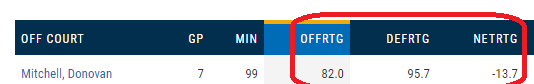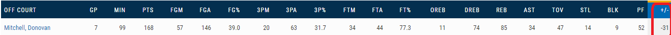 不过当米切尔下场后,爵士的进攻效率就直线下滑至82,这是联盟垫底的进攻效率。米切尔不在场,爵士百回合净负13.7分。