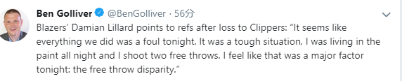 利拉德在赛后的采访中将矛头指向了裁判:“今晚好像我们做什么都是犯规。我整场比赛都在进入内线,但我仅仅罚球两次。我感觉这是今晚的一个重要因素:罚球数的悬殊。”
