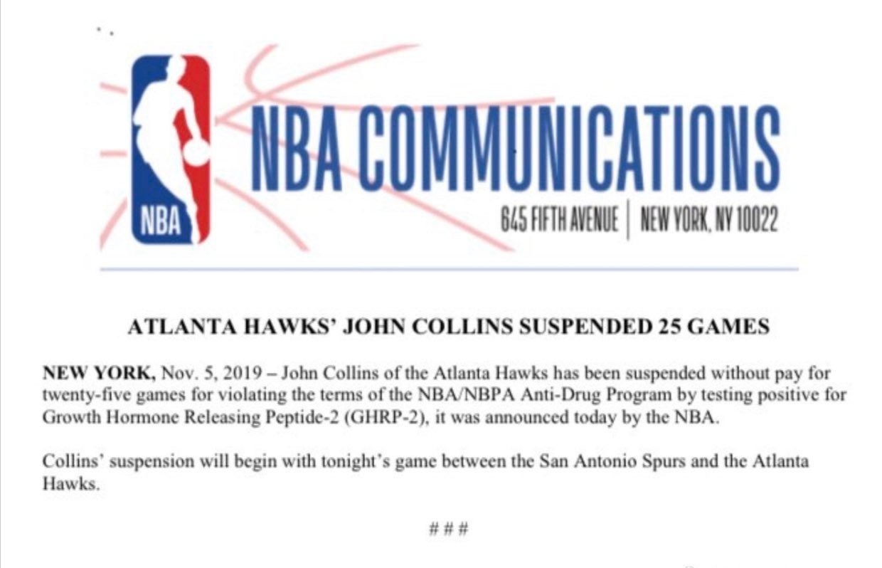 今日NBA官方宣布,老鹰前锋约翰-科林斯因为违反了禁药规定,被联盟禁赛25场!联盟称柯林斯的生长激素释放肽检测结果为阳性。Bobby Marks跟进报道,因为这25场禁赛,科林斯将损失610582美元的薪水 ???。柯林斯和特雷杨是老鹰内外线的年轻核心,这一下伤害还是有点大啊! ???