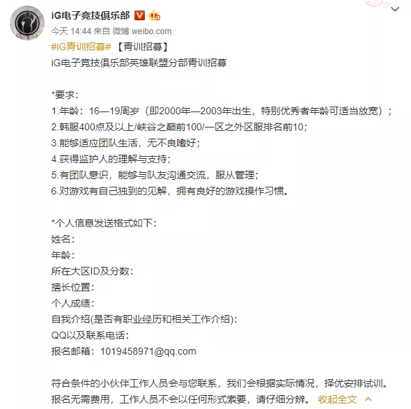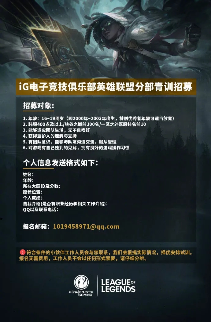 iG今日发布青训招募公告,要求韩服400点及以上/峡谷之巅前100/一区之外区服排名前10,年龄16-19。带伙儿有没有想帮Shy哥养猪的,想让JackeyLove教你插眼的,可以开冲了。现在报名,还有机会在本土捧得S10冠军奖杯。也许您还喜欢:世界杯直播 亚洲杯直播 欧洲杯直播 足球直播