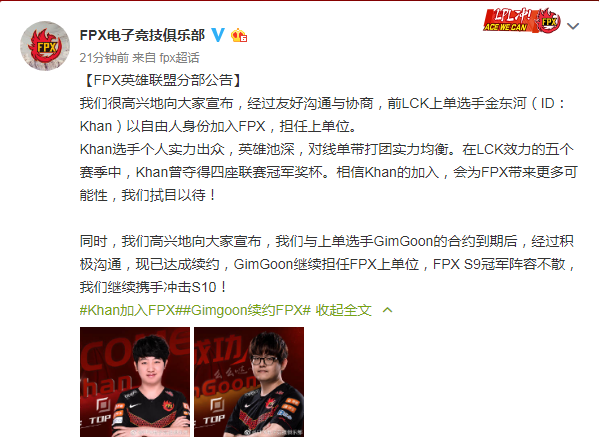 ?同时,我们高兴地向大家宣布,我们与上单选手GimGoon的合约到期后,经过积极沟通,现已达成续约,GimGoon继续担任FPX上单位,FPX S9冠军阵容不散,我们继续携手冲击S10!