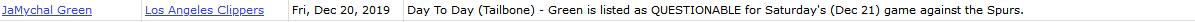快船:杰迈克尔格林尾骨受伤,出战存疑。