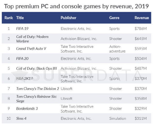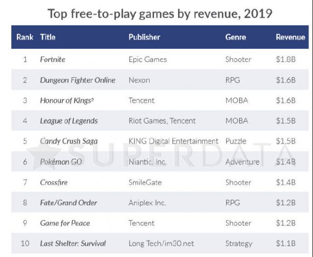 免费游戏排行1.《堡 垒 之 夜》 18亿2.《地下城与勇士》16亿3.《王者荣耀》 16亿4.《英雄联盟》 15亿5.《糖果传奇》 15亿6.《宝可梦 go》 14亿7.《穿越火线》 14亿8.《FGO》 12亿9. 《和平精英》 12亿10.《末日孤城》11亿付费PC游戏和主机游戏排行1.《FIFA19》 7.86亿2.《使命召唤 现代战争》6.45亿3.《GTA5》 5.95亿4.《FIFA20》 5.04亿5.《使命召...也许您还喜欢:世界杯直播 亚洲杯直播 欧洲杯直播 足球直播