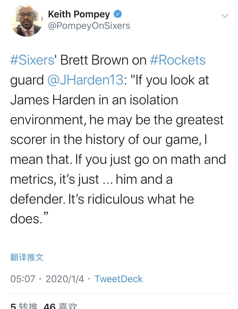赛前一奶。人人都在学马龙。包夹从马龙开始。赛前奶哈登也从马龙开始。76人主教练布朗:哈登可能是史上最强的一对一单打得分手