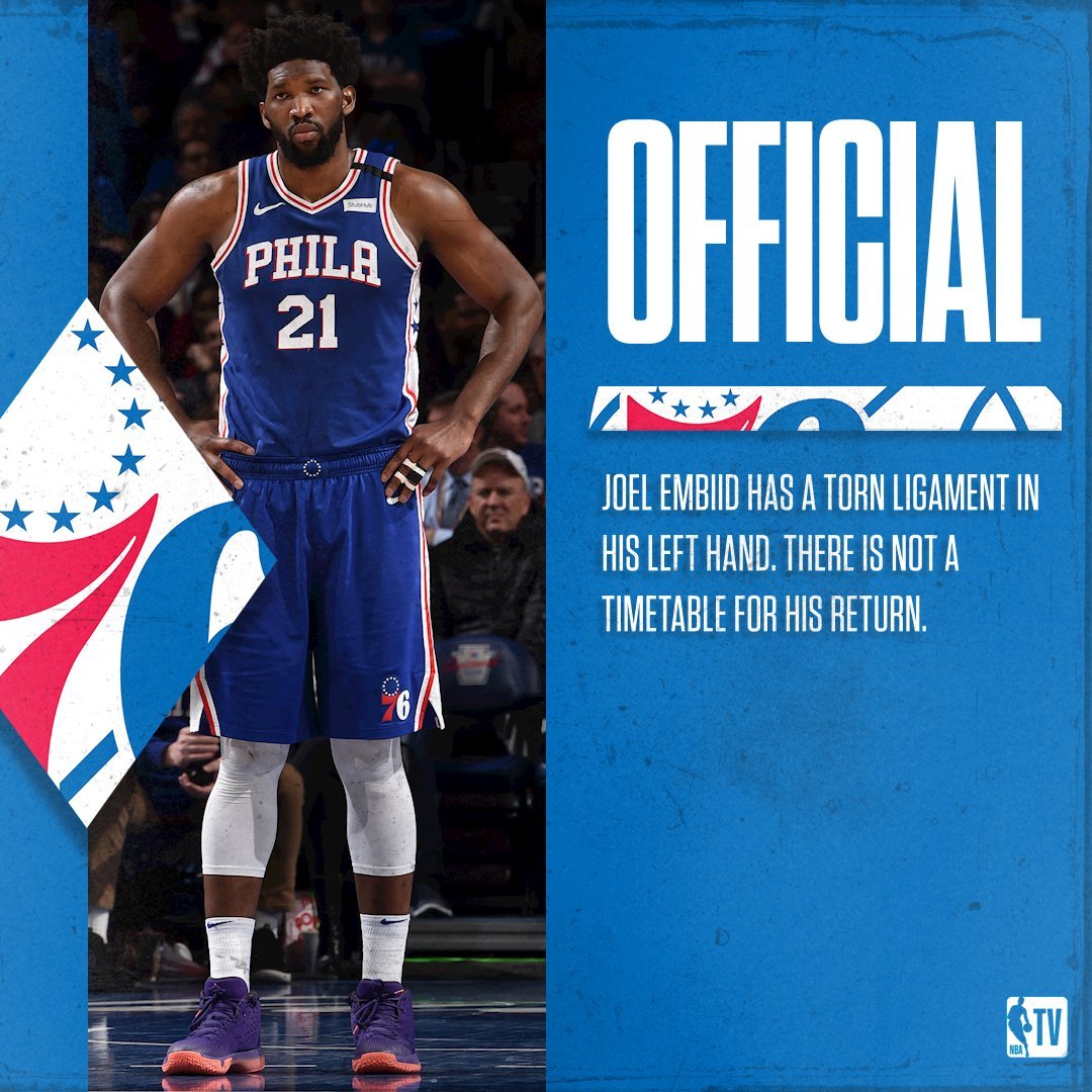 根据NBA名记Shams报道,恩比德左手韧带撕裂。明日在纽约接受手指韧带修复手术。伤病将在手术后1-2周重新评估。