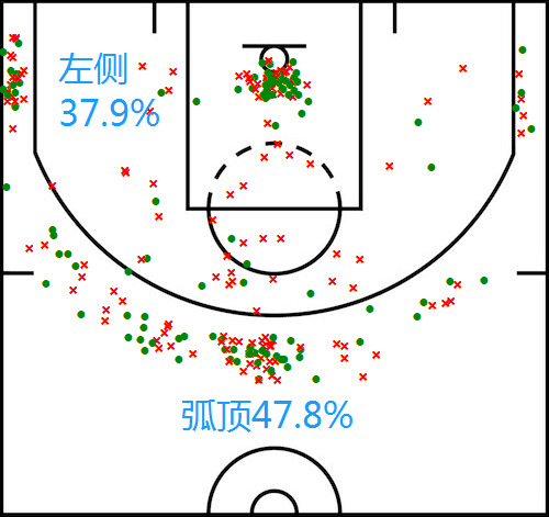 迈克德莫特一直是以三分球投射闻名,上赛季他的三分命中率就已经高达40.8%,令我意外的是他这赛季居然还在继续进化,在出手次数增加的情况下,他的三分命中率上升到了46.0%(投篮出手数从上赛季的场均2.7次升至这赛季的4.2次)。同时他的投射水平也越来越稳定——上赛季他在主场的三分投射仅有惨淡的31.3%,不过这赛季他的主场三分命中率则大幅提升到41.1%;在主要的出手位置上,无论是左侧底角(37.9%)?还是在弧顶的位置(47.8%),迈克德莫特三分投射的表现都相当理想;至于接球就投方面,他更是有高达46.9%的惊人命中率。