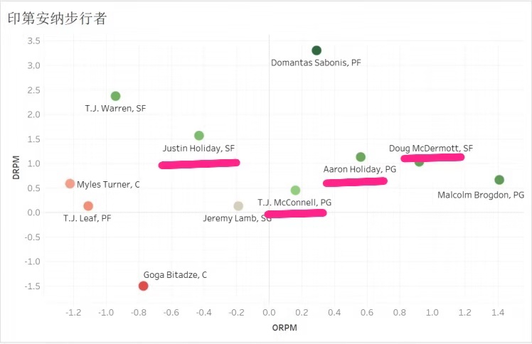 上图为步行者轮换球员的真实正负值,纵轴代表防守真实正负值(DRPM),横轴代表进攻真实正负值(ORPM)。可以看到这四名替补球员的防守真实正负值都是大于0的,并没有拖球队的后腿,而在进攻真实正负值上,除了防守侧翼贾斯汀霍乐迪为负值以外,其余三名球员都是正值,因此我们能够发现,阿隆霍乐迪和麦康奈尔其实是很大程度上弥补了奥拉迪波的伤缺,他们二人一同消化了后者的球权,并且迈克德莫特的进攻正负值也是仅次于球队首发后卫布罗格登。更重要的是,这四名优质轮换球员的年均薪资都不超过800万(最高的也只是迈克德莫特的733万),这是一个非常良好的薪资结构。