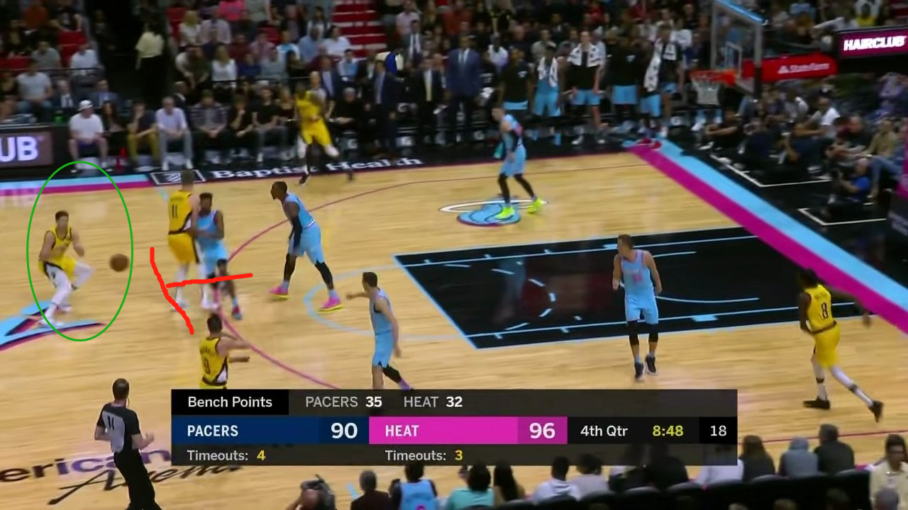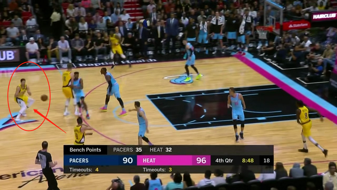 除了麦康奈尔之外,步行者板凳席进攻火力的最大输出,就是来自射手迈克德莫特与小萨博尼斯的配合。自从上赛季加盟以来,迈克德莫特的无球跑动与小萨博尼斯的无球掩护一直是替补阵容的主要进攻手段之一,迈克德莫特会利用小萨博尼斯的无球掩护,跑出空位后直接接球就投(上图就是小萨博尼斯作无球掩护,迈克德莫特跑位获得空位三分的机会)、第二种选择则是接球后直接切入或在中距离急停跳投,当然也可以传球给到小萨博尼斯跟进下顺得分。