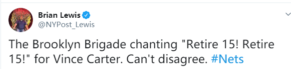据现场的记者报道,篮网和老鹰比赛中,篮网现场的观众都在大喊:“退役卡特的15号球衣!退役卡特的15号球衣!”