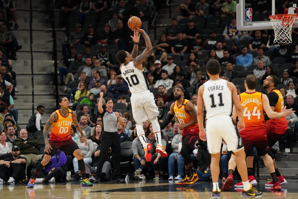 马刺胜爵士, 德罗赞全场拿到38+5+5,最后时刻连得9分接管比赛。