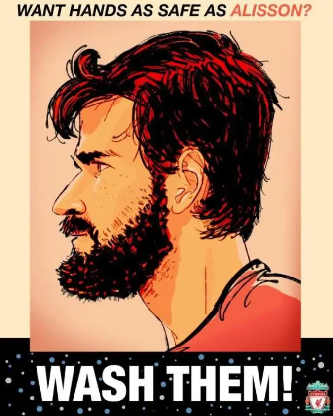 为了呼吁大家居家隔离应对疫情,利物浦俱乐部发了一个特别版抗疫海报,主题是巴西国门阿利森,配的文字是:“想要双手像阿利森那样安全吗?好好洗它们!!”
