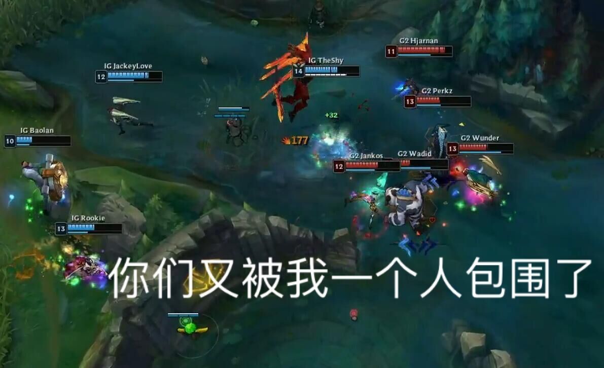之后的一波团战,Shy哥的剑魔收到了两个头,然后就到了这个名场面: