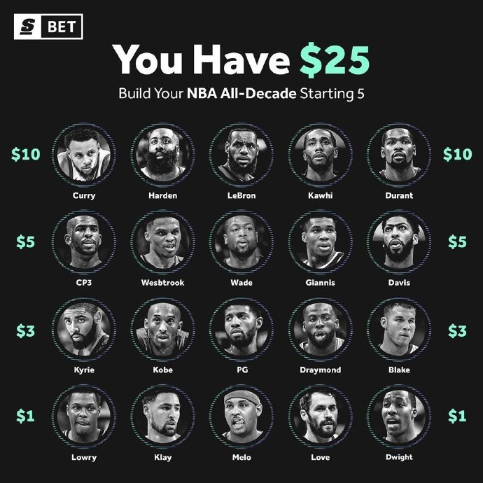 给你25美元组一套首发阵容,前提是一旦选择了在雷霆效力过的球员,金额翻两倍,你会怎么选择?我先来,威斯布鲁克,乔治,欧文,字母哥和霍华德。