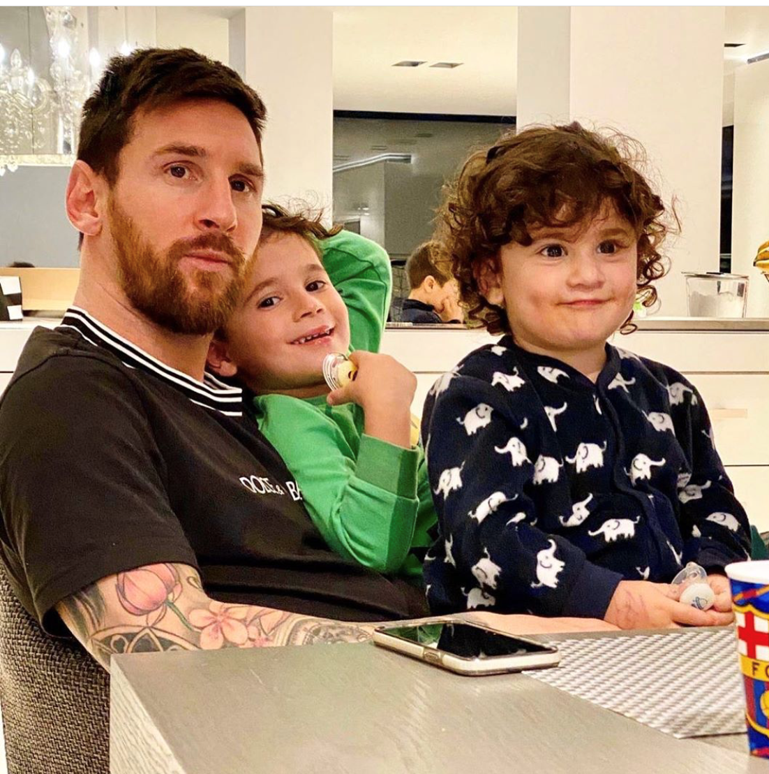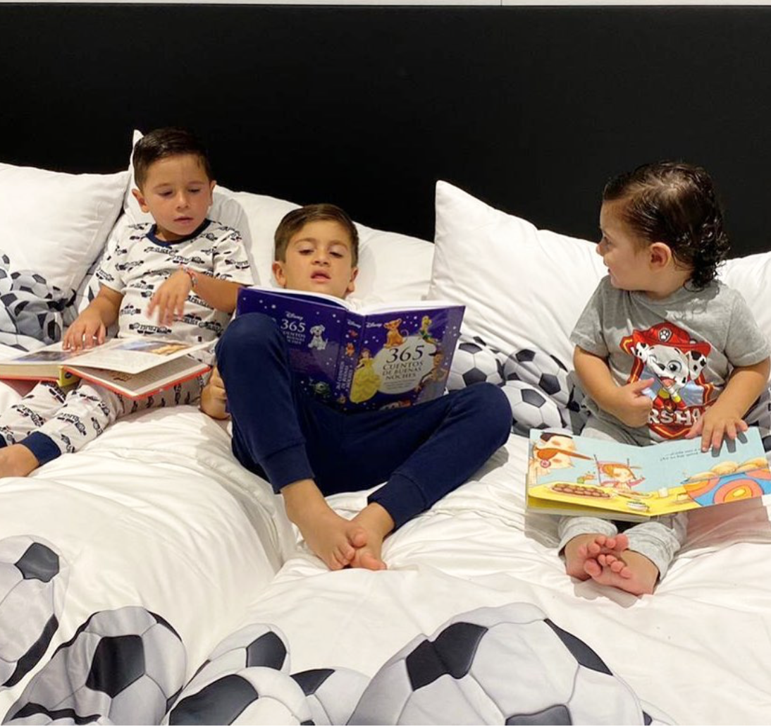 梅西在社交媒体上晒出了三个孩子躺在床上学习的图片,三个儿子的头发看起来湿湿的,大概是刚刚洗完澡。蒂亚戈拿着一本365夜故事书,还不认识字的Ciro把书拿反了。梅西在照片旁用西班牙语和英语配文:好好待在家里。