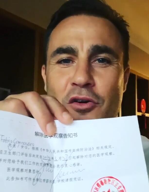 今日,广州恒大主帅卡纳瓦罗晒出解除医学观察告知书,结束了隔离生活,终于自由了!