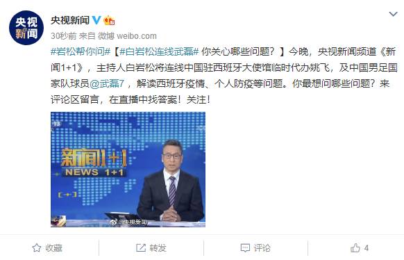 亲口所言才是真信息!今晚央视新闻频道《新闻1+1》,白岩松将连线武磊[奋斗][奋斗]加油!今晚21点30分,央视新闻频道《新闻1+1》,主持人白岩松将连线中国驻西班牙大使馆临时代办姚飞,及中国男足国家队球员武磊,解读西班牙疫情、个人防疫等问题。
