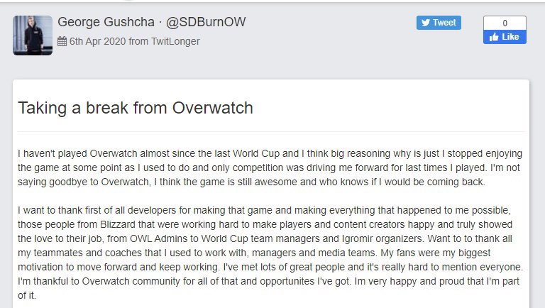 继taimou,tviq等人之后,sdb也宣布暂别守望先锋舞台。曾经的源氏滴神,俄罗斯国家队的中流砥柱,在owl赛场也有着亮眼表现的sdb也断开连接。[流汗][流汗]ow真的越来越8??行了