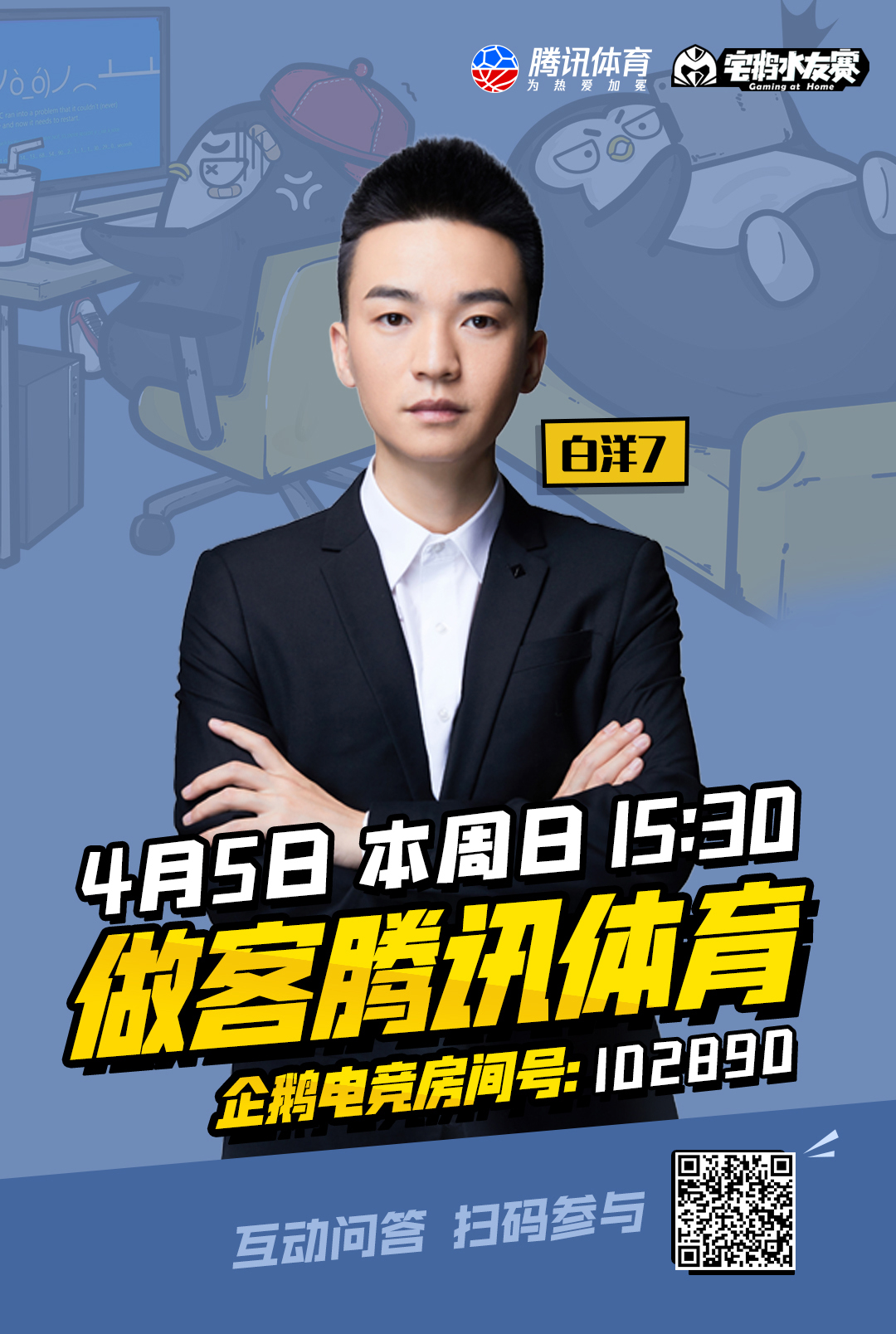 明星&主播&粉丝?互动PK的电竞直播赛事,宅家称霸。等你参团、3月21日起?每周六晚?7:30?腾讯体育、企鹅电竞、微视等平台准时上线。记得来看直播哦~