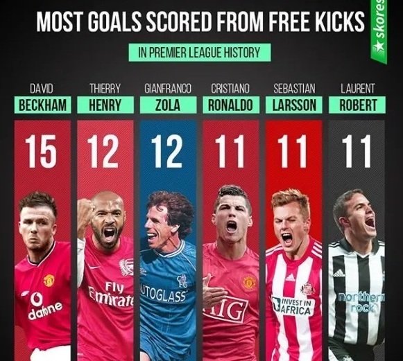 任意球得分上,小贝排名第一,一脚弧线球无人出其右。
