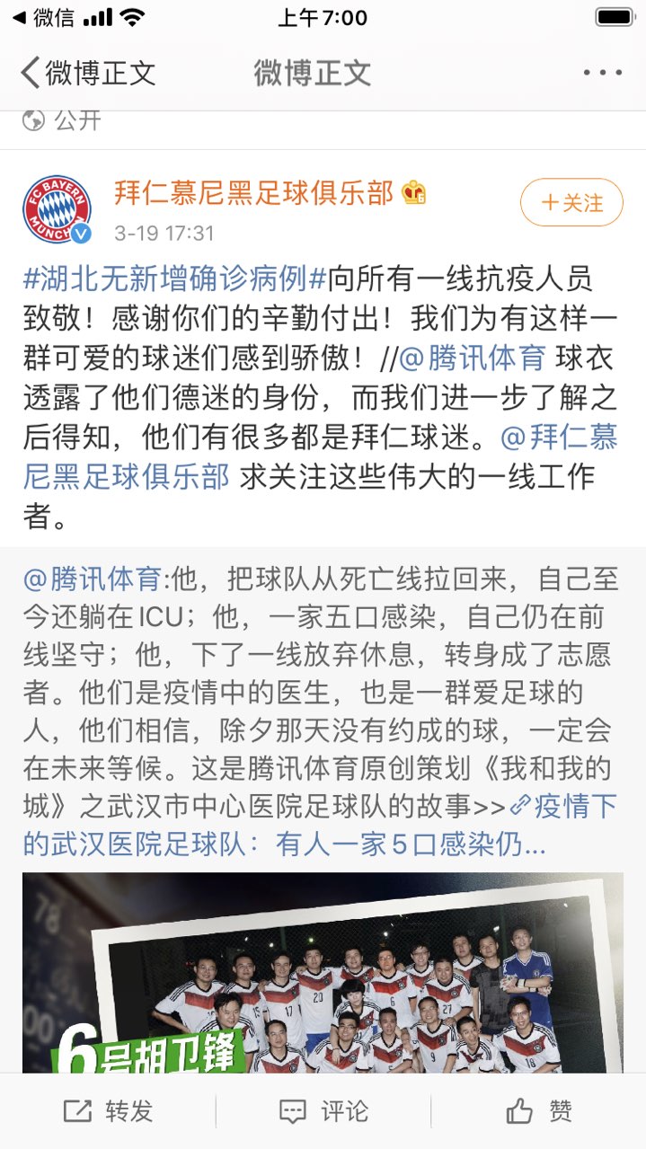 上月,我们《我和我的城》系列讲述了武汉市中心医院足球队的故事。看到他们提供过来的足球队的照片,身穿德国球衣,于是就去询问他们大部分人最喜欢的俱乐部果然是拜仁。马上把这个消息告诉拜仁俱乐部,拜仁那边也很感动,策划了很多事情。但是足球队的医生们太忙了,他们很多人其实都还在一线,经常是发一条信息,几天才...也许您还喜欢:世界杯直播 亚洲杯直播 欧洲杯直播 足球直播
